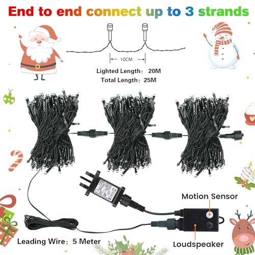 With a generous length of 25 metres and 200 high-quality LEDs, these lights are perfect for a variety of settings—be it wrapping around your Christmas tree, draping across your garden, or lighting up your patio for a cozy gathering. The unique motion sensor feature adds an interactive element, allowing the lights to flicker to festive music as guests enter the area, making it not just a decoration but an experience.