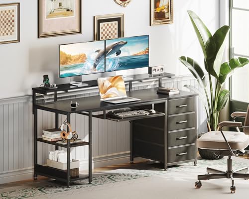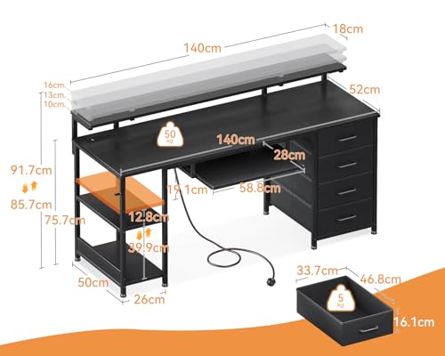 ODK 140cm Black Computer Desk with 4 Fabric Drawers, Gaming Desk with 2 Sockets & USB Ports, PC Table with Storage for Home Office, Small Study Table for Bedroom with Keyboard Shelf