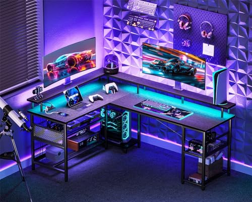ODK L Shaped Gaming Desk with LED Lights & Power Outlets, 168×120cm Reversible Corner Desk with Storage Shelves, Computer Desks with Monitor Stand, Black