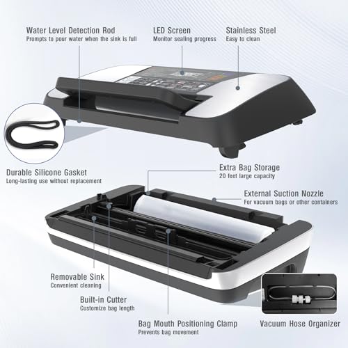 Not only does this vacuum sealer save you money by reducing food waste, but it also allows for easy organisation in your freezer or pantry. With integrated bag roll storage and a built-in cutter, you'll have everything you need at your fingertips.