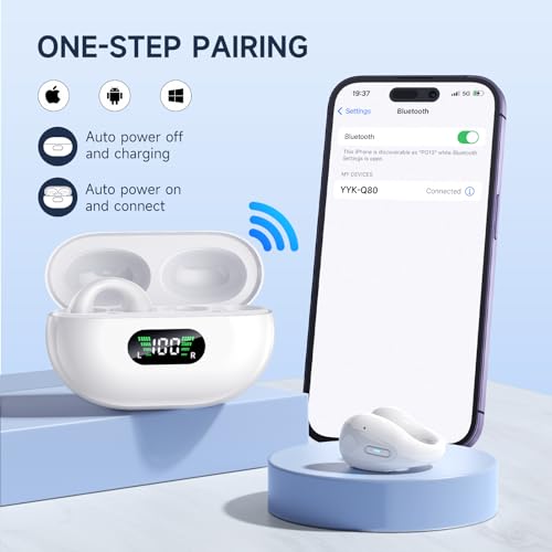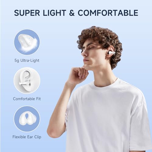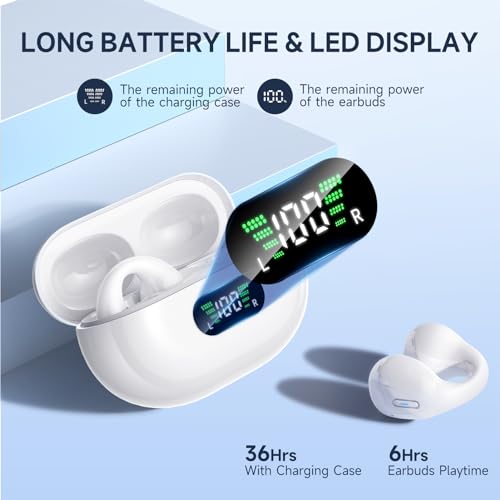 Open Ear Bone Conduction Headphones,Comfort-Clip On Wireless Earbuds Bluetooth 5.3, Sports Ear Buds with ENC Mic, 36 Hours HlFl Earpods with LED Display Charging Case,lPX7 Running Earphones, White