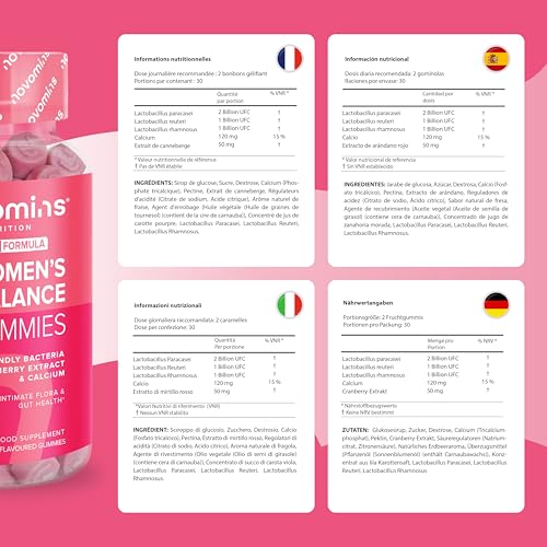 - Discover the delightful way to enhance your gut health with Novomins Probiotic Gummies – Women’s Bio-Balance Gummies! Infused with four powerful strains of probiotics, these scrumptious strawberry gummy bears are designed to support your digestive system and intimate flora, making gut health a delicious experience. Unlike traditional probiotic supplements, our gummies are not only tasty but also free from artificial colours and preservatives, ensuring you're only consuming the best. Plus, they are NON-GMO and halal, catering to a variety of dietary preferences.