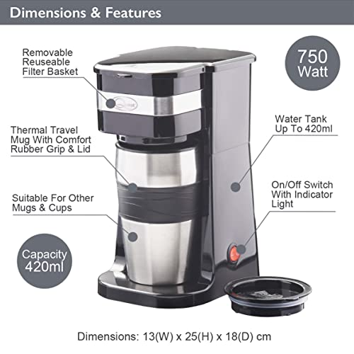 Quest 35189 Filter Coffee Machine/Portable Travel Filter Coffee Maker / 420ml Capacity/Thermal Travel Mug Included/Works with Ground Coffee & Coffee Pods/Instant Espresso & More