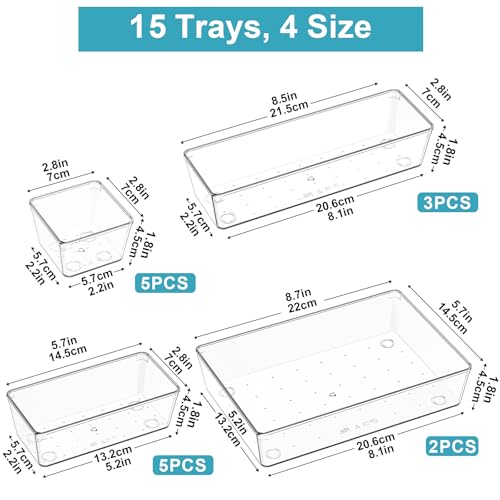 Radikor Drawer Organiser Set, 15pcs Clear Plastic Makeup Drawer Organiser Trays, 4-Size Desk Drawer Inserts/Dividers, Acrylic Storage Bins for Make Up, Cosmetic, Vanity, Officce, Bathroom