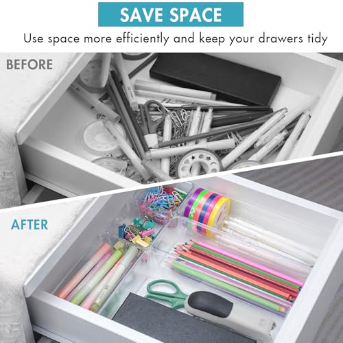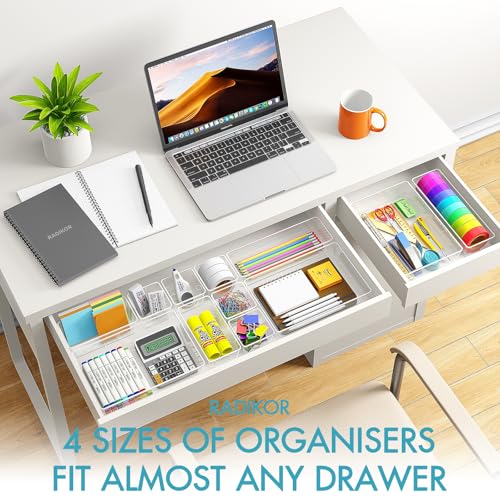 - Are you tired of rummaging through cluttered drawers in your kitchen, bathroom, or office? Introducing the Radikor Drawer Organiser Set, your ultimate solution for effortless drawer organisation! This thoughtfully designed set includes 15 clear plastic trays in four versatile sizes, making it easy to organise everything from makeup and cosmetics to stationery and kitchen utensils, ensuring everything has its place.