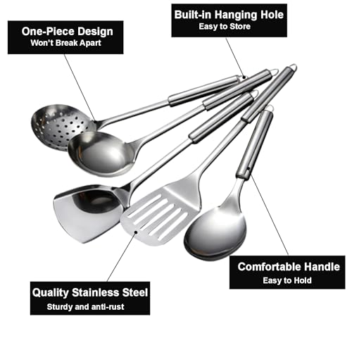 Ragyzity Stainless Steel 5-Piece Utensil Set, 5-Pieces All Metal Long Handle Cooking Tools, Heat Resistant Kitchen Gadgets Utensil Set, Slotted Spoon, Slotted Spatula, Large Spoon, Soup, Spatula