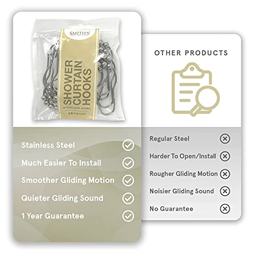 Plus, with a one-year satisfaction guarantee, you can purchase with confidence. Experience the difference with Smith's Stainless Steel Shower Curtain Hooks—your bathroom deserves it!