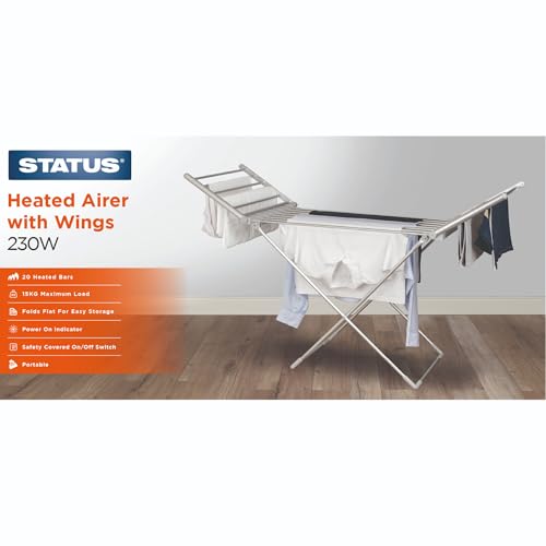 - Discover the ultimate solution for efficient laundry drying with the Status Heated Clothes Airer, Aluminium Winged Electric Drying Rack (AHCA-220W1PKB). This innovative drying rack not only reduces energy consumption but also ensures your clothes are dried quickly and effectively, making it a win for both your wallet and the environment. Crafted from premium non-rust aluminium, this airer boasts unparalleled durability, eliminating concerns about corrosion or staining that can plague inferior models.