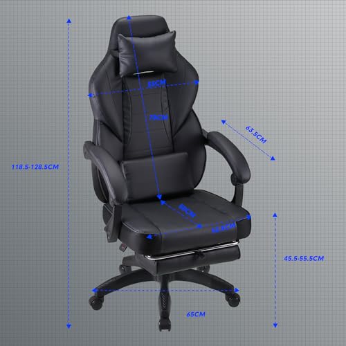 T-THREE.High-back ergonomic computer chair, gaming seat, office and study swivel chair, racing-style with adjustable lumbar and headrest support, 150kg capacity, includes footrest.(Black)