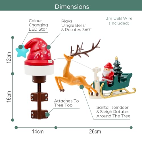 The Christmas Workshop 73669 Rotating Light Up Christmas Tree Topper/Santa, Sleigh and Reindeer Christmas Decoration/Colour Changing LED Lights/USB or Mains Powered