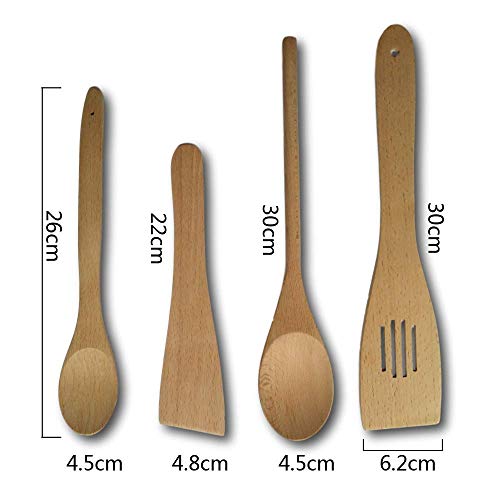 Tianfeng Cooking Style 4 Piece Wooden Kitchen Utensils Set Natural Wood Spoons & Spatulas for Mixing, Stirring, Scooping & Tasting Long Handles, Non-Toxic, Strong & Sturdy