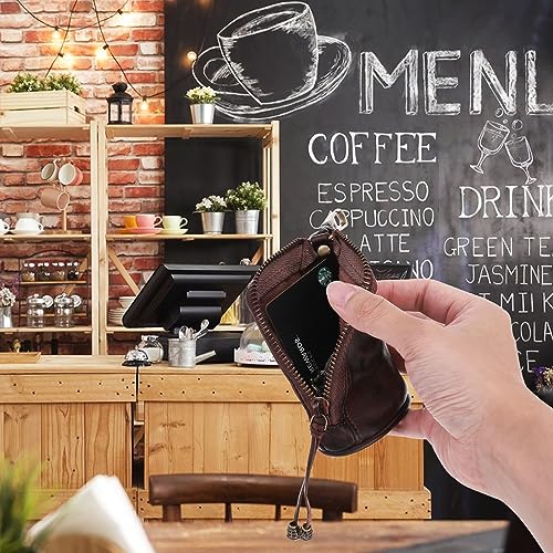 TIESOME Vintage Genuine Leather Zipper Coin Purse, Medieval Cowhide Change Holder Coin Pouch Wallet Coin Organizer with Key Ring Little Travel Wallet for Men(Coffee Color)