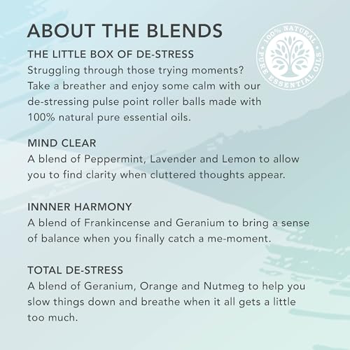 - Discover serenity with Tisserand Aromatherapy's Little Box of De-Stress, expertly crafted to help you navigate the stresses of everyday life. This delightful collection features three unique Pulse Point Roller Balls, each containing 100% natural pure essential oils designed to enhance your wellbeing. The Mind Clear blend, featuring invigorating Peppermint, soothing Lavender, and zesty Lemon, helps to declutter your mind and restore focus. Inner Harmony, a calming fusion of Frankincense and Geranium, promotes emotional balance and tranquility. Lastly, the Total De-Stress blend combines Geranium, Orange, and Nutmeg to wrap you in a comforting embrace, alleviating tension and fostering relaxation.