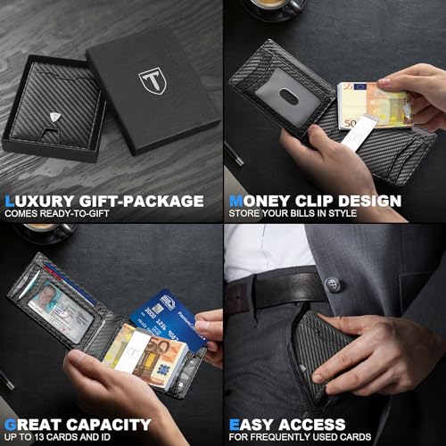 Looking for the perfect combination of style, security, and convenience? The Tomylv Men's Slim RFID Blocking Carbon Fiber Leather Wallet is your ideal solution. Designed for the modern man, this wallet stands out with its minimalist aesthetic while providing ample space for all your essential cards and cash.