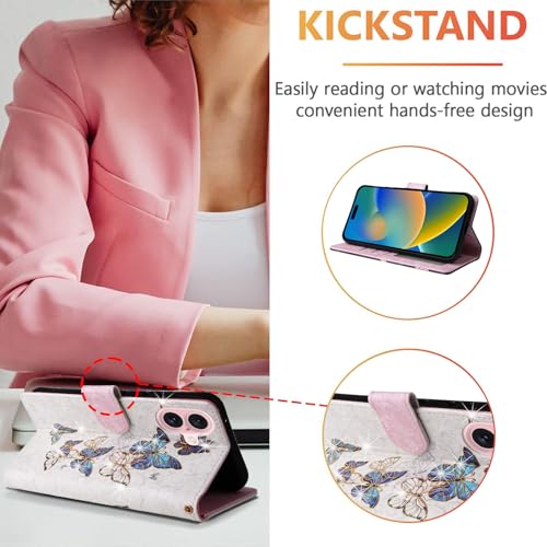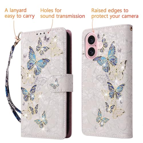 UEEBAI Wallet Case for iPhone 16 6.1", PU Leather Phone Case Kickstand RFID Blocking Flip Case Card Slots Wrist Strap Relief Engraved Pattern Magnetic Closure Folio Case - Blue Butterfly