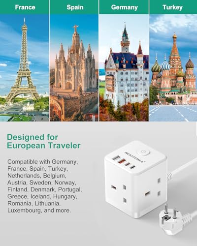 Travelling to Europe? Don’t forget to pack the ROOTOMA 7-in-1 UK to European Plug Adapter! This innovative device is designed to meet all your charging needs while you explore the continent.