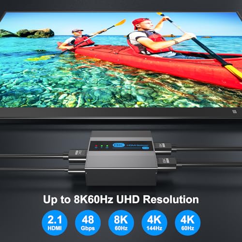 VEDINDUST 8K60Hz HDMI 2.1 Splitter 1 In 2 Out 4K120HZ for Dual Monitors Supports EDID HDCP2.3 for Xbox PS4 PS5 Roku Blu Ray Player Two can be Displayed Simultaneously