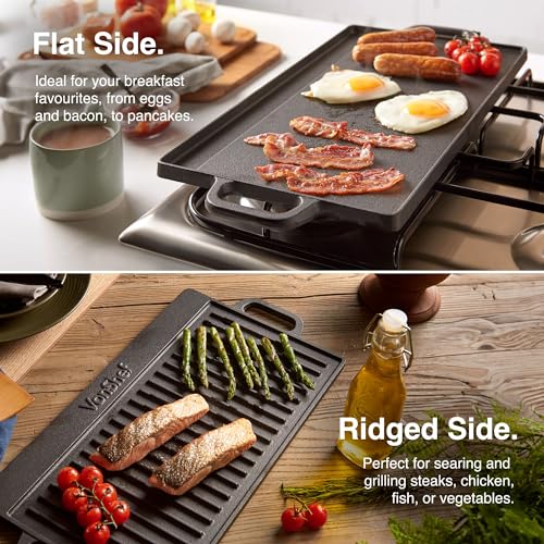 Are you ready to take your cooking to the next level? The VonShef Reversible Griddle Pan is your perfect kitchen partner, designed to create healthier meals without sacrificing taste. This cast iron marvel features a unique double-sided design: one side boasts ridges to give a beautiful sear to meats and veggies, while the other flat side is ideal for breakfast staples like eggs and pancakes.