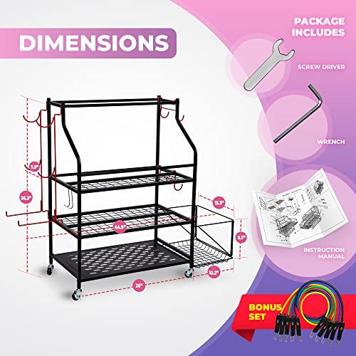 Imagine having a dedicated space for all your fitness gear. With its three spacious shelves, multiple hooks, and a side basket, this rack allows you to access your equipment quickly and easily. Plus, the lockable rolling wheels mean you can rearrange your setup whenever you need to create the perfect workout environment.