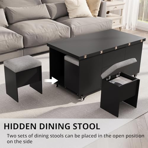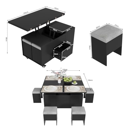 VOWNER Lift Top Coffee Table, 4-in-1 Multifunctional Coffee Table Convertible into Living Room Dining Table, Height Adjustable, with Storage Space with 4 Stools, 108Lx105Wx68H cm, Black
