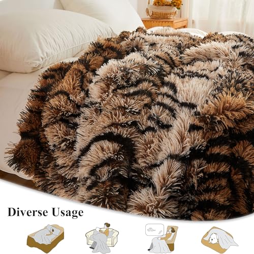 XeGe Luxury Faux Fur Throw, Soft Tiger Print Big Fluffy Bed Blanket, Shaggy Plush Decorative Farmhouse Couch Throw, Furry Fuzzy Blanket for Sofa Bed, Tiger Print Brown, Twin/Double