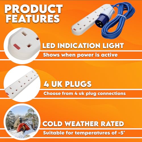 Equipped with four UK plugs, this extension lead allows you to power multiple devices at once. Whether you need to charge your phone, power a small fridge, or keep the lights on, this lead ensures you won’t run out of sockets. Plus, it’s not just versatile in use; it’s also built to last. Crafted with high-quality materials, it can withstand the rigours of outdoor life, giving you peace of mind during your adventures.