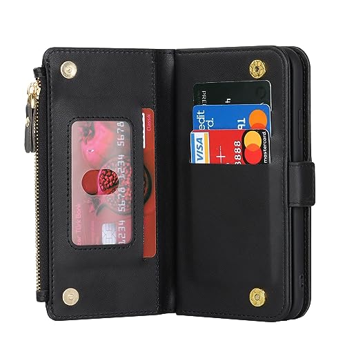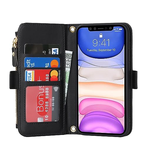 Zouzt for iPhone 11 Wallet Case for Women, Purse with Credit Card Holder Slots Crossbody Lanyard Strap Zipper Flip Book Shockproof Protective Phone Cover for Apple 11 6.1 Inch (Black)
